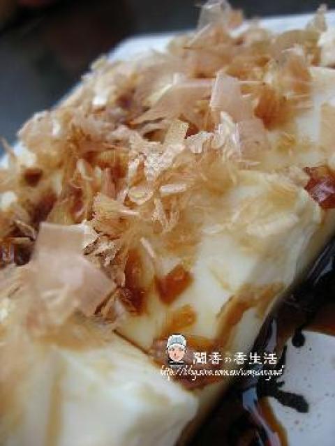 2.将木鱼花均匀摆放在豆腐上,倒上少许酱油即可