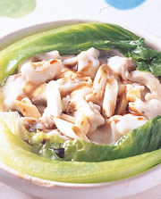 5.沿作法4砂锅边淋上油,加盖小火续煮3分钟,开盖淋上酱油再加盖煮2分钟,熄火后焖焗15分钟,开盖撒上葱花,排入烫好的青菜即可。