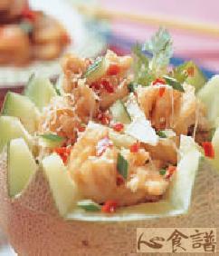 5.将作法4所拌好的鱼球及果肉材料等,放入哈蜜瓜盅里,再洒上白芝蔴即完成。