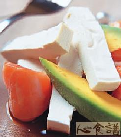 传统豆腐60公克,酪梨2片,鲑鱼生鱼片60公克,淋酱:1大匙,米醋2大匙,酱油2大匙,糖1/2小匙,绿芥末适量,柠檬汁1小匙