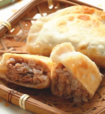 4.锅烧热加入1大匙沙拉油,放入作法3包好的洋葱鲔鱼盒子,转小火将盒子三面平均烙过,最后盖上锅盖焖约2分钟即可。