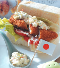 6.大亨堡略烤上色后,于中间面包部份涂上奶油,依序夹入作法5的蛋皮,再将作法4的烧面平舖于蛋皮上,淋上适量作法2的酱汁,撒上柴鱼片、青海苔粉即可。