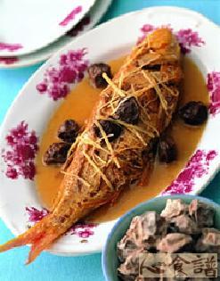 金线鲢1尾,话梅10粒,姜丝1/4杯,水4杯,盐2小匙,糖1/3大匙,香油2小匙