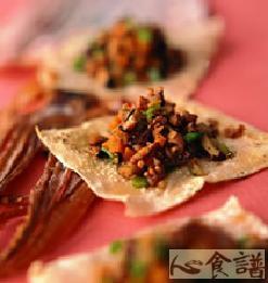 (4)将鱿鱼鸽松馅料盛于馄饨皮上即可食用。