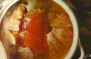 3、炒锅炉置旺火,下熟猪油75克,烧至七成热,投入葱段煸出香味,加入绍酒35克和清汤50克,稍后,拣去葱段,放入鱼翅,加姜汁水、火腿踵原汁,烧沸后,改用小火煮5分钟左右,再转为旺火,放入精盐和味精,把湿淀粉调稀,边淋边轻轻转动炒锅炉,并沿锅边淋入熟猪油25克,放入焯熟的豌豆苗,淋上熟鸡油,出锅扒入盘中火腿踵上面,同时将2块火腿踵复盖在鱼翅上,即成。