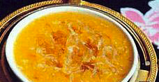 2.将炒锅置中火上,下熟猪油25克,烧至五成热,投入葱、姜末和蟹粉煸炒,稍后,烹入绍酒15克加进高级清汤和精盐少许,稍烧盛起。