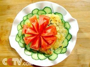 (1)黄瓜洗净取皮,焯水后漂凉,刻成荷叶和茎;番茄烫后撕去皮,切成瓣;芋头刻成藕入沸水锅中煮至断生后捞出漂凉;西兰花掰成小朵后焯断生,均需渍入味,然后把这些东西在盘中拼摆成荷花的茎、叶、及鲜花、水草。