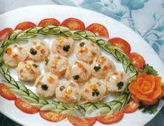 (4)将一串虾胶分别酿在20个小碟上(小碟要先涂上猪油),然后将鱼翅放在虾胶上面,又一次酿上虾胶,再用蛋白抹滑,放上火腿术,芫荽叶、芹菜末、金笋化,放入蒸笼用旺火炊熟,取出鱼翅,摆砌盘间,把原汤约100克调上味,用生粉水勾芡淋上即成。