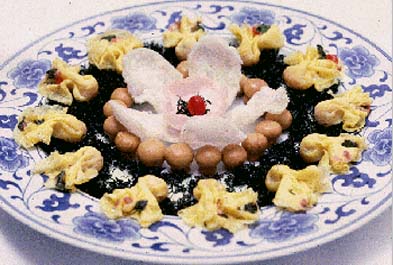2、鸡蛋清搅匀,拌入虾料子内。取小酒杯12个,逐个抹上熟猪油,将鸡蛋清、虾料子放入杯内,周围镶入5粒青豆,中间放一粒青豆,上笼蒸2分钟,即成莲蓬,入笼内保温。