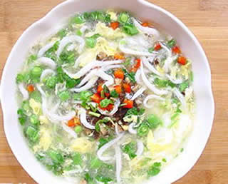 主料:银鱼,辅料:南豆腐,红柿子椒,香菇,鸡蛋,香菜,葱,姜,调料:盐,鸡精,胡椒粉,香油,淀粉