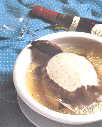 水鱼1只(约600克),薏米25克,湿香菇25克,笋花6片,赤肉100克,熟火腿30克,上汤600克,蒜头肉几粒,鸡壳,味精,绍酒,姜,葱,精盐,胡椒粉,芝麻油