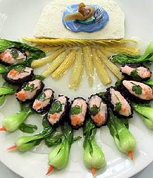 (3)将鱼卷入盘堆摆成菊花形,再用黄瓜切刻成菊花叶片,安放在菊花下端,即成