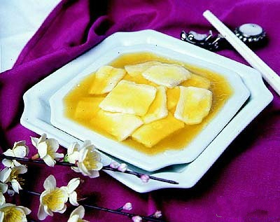 3、木耳于开水中汆透,捞出控水。将鸡汤、精盐、味精、白糖于汤锅中调好上火,放入滑开的鱼片。汤微开后放入香糟酒、勾芡、淋入鸡油,装盘拖放在木耳上,即可。
