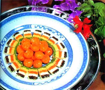 4、然后将切好的香菇丝、熟火腿丝、蛋皮丝和虾黄末、菜松点缀在虾茸上面(要点缀得均匀、整齐),摆在盘内,上笼屉用小火蒸熟后,取出,摆在盘的外圈;