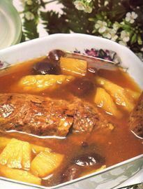 主料:酱凤梨150公克,苦瓜1条。生香菇5朵,素鱼1条。糖5大匙,酒1大匙,盐少许。