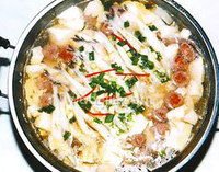 4.再将银鱼、香菇丝放入火锅里,食前10分钟,烧红木炭放入火锅的炉膛内,火锅烧沸,再加入猪油、味精、胡椒粉、青蒜丝,盖上火锅盖,连同各料盘一起上桌摆好,即可食用。
