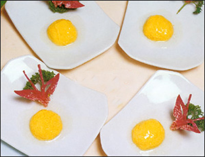 2.鱼茸做成丸;咸蛋黄蒸熟后,打成细粉,再用鱼丸裹上蛋黄粉后上笼蒸熟,上席时打玻璃芡即可。