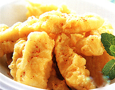(3)鱼条分别沾上面煳,入八分热油锅中炸至酥黄捞出。