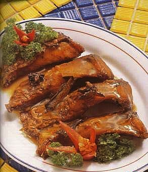 4、锅中留底油,油热后先下大料、桂皮、花椒煸炒片刻,再加入葱姜,煸炒后依次加入适量酱油、料酒、醋、盐、糖、味精(稍后放),最后下鱼,加水,水量以稍低于鱼量为宜。先用大火烧开,然后改用小火火靠,直至汁浓味厚。取出鱼放于净盘中。锅内浓汁打明油,淋在鱼上面即可。晾凉后入冰箱待上菜。