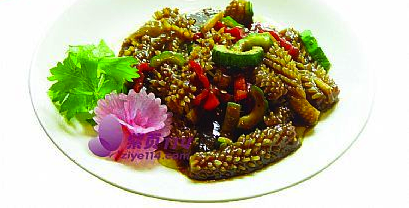 主料:净鱿鱼500克,笋片,黄瓜片各30克,油1500克(约耗100克),料酒30克,醋15克,盐2克,味精5克,葱花,蒜片各2克,水淀粉40克,花椒油20克。