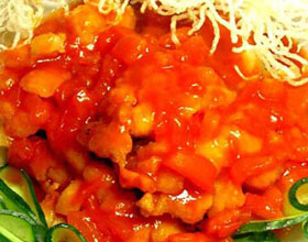 4.炒锅留油置旺火上,下人葱、姜、黄酒、排骨汤200毫升、盐、糖、醋、番茄酱烧沸,用淀粉调稀勾芡,淋入熟猪油,浇在菊花鱼上即成。