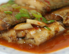 5.放入炸好的带鱼,加入精盐、白糖、香醋、味精烧至带鱼入味汤将干时,淋入香油装盘;
