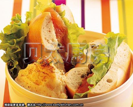 圆面包圈1个,新鲜三文鱼1片,牛油、蛋黄酱各1茶匙5g,生菜叶、番茄片、酸黄瓜各1片