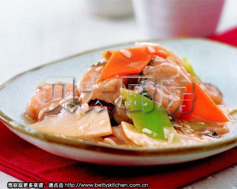 中火烧热炒锅中的油,放入葱末、姜末和蒜末爆香,再放入冬笋片、胡萝卜片和莴笋片翻炒片刻,随即放氽好的鱼片,调入余下的盐和料酒、米醋、白砂糖、酱油、醪糟和高汤,开锅后用水淀粉勾芡,出锅前淋入芝麻香油即可。