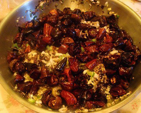 7、a锅内剩下的油加热,先放入花椒粒,爆出香味后,放入灯笼椒,不停翻炒,很快,灯笼椒变成深红色,连同