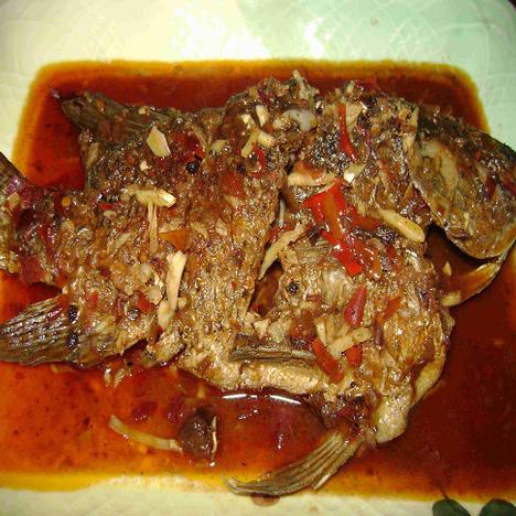 4.锅里再倒些油,把剩下的姜片和葱白放进锅里爆香.把上面的酱汁倒进烧开后 把煎过的鱼放进锅里,倒少许料酒,用中火焖15分钟左右,焖的时候,鱼的两面都 要焖透,这样才入味.如果汁太稠了,要加点水,