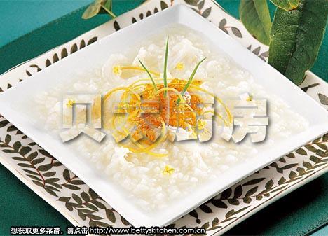 3、在大米中加入适量水(约4碗,1000ml)煮成白米粥,烧滚后依次放入鲈鱼片、橙皮丝和糖桂花,再调入盐、白胡椒粉搅拌均匀即可。