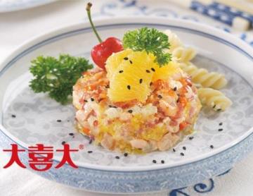 将三文鱼、培根、洋葱、香橙切成均与的颗粒状,锅中热黄油,煸炒所有主料粒,然后用大喜大海鲜粉、大喜大烤肉酱、沙拉酱调味,最后撒上芝士。