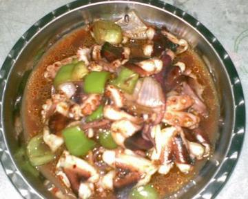 章鱼爪10副,青椒1个,洋葱1个,生姜1小块,料酒1汤勺,醋1汤勺,盐半勺,糖1勺,酱油3汤勺,香辣豆豉1大勺,食用油适量