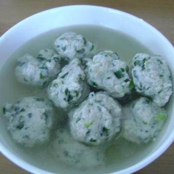 2、锅内加鲜汤,急火烧开,将鱼馅挤成丸子下锅,用慢火烧开,至丸子熟透,加入菠菜丝、胡椒粉,撤上韭菜末,淋上香油,盛入碗内即成。