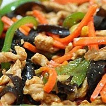 猪肉200克,青椒30克,胡萝卜15克,木耳10克,辣椒、姜、葱、蒜、白糖、酱油、醋、油、淀粉、盐各适量