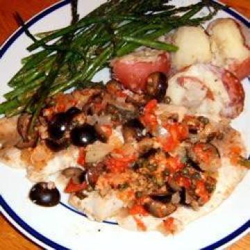 李子形番茄5个,橄榄油2汤匙,红洋葱半个,切碎,大蒜2瓣,切碎,干牛至少许,白葡萄酒4汤匙,卡拉迈橄榄24个,去核,切碎,酸豆4汤匙,新鲜柠檬汁1汤匙(15毫升),新鲜罗勒叶6片,切细碎,意大利帕马森干酪3汤匙,磨碎,小比目鱼排500克,新鲜罗勒叶,6片,撕烂