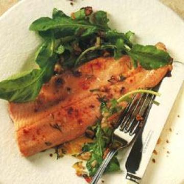 菜油2茶匙,新鲜鳟鱼肉4块,每块约重175克,辣椒粉1/4茶匙,半边核桃仁10片,芝麻菜(rocket)、水田芥(西洋菜)或混合沙拉菜叶125克,沙拉酱材料:,冬葱1颗或大葱2根,新鲜莳萝或芹菜叶数枝,香米醋或雪利酒醋2汤匙,核桃油6汤匙,盐、黑胡椒适量