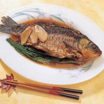 鲫鱼2条,共约1.2千克,大葱300克,生姜3片,花生油480毫升(另加2汤匙),酱油3汤匙,镇江醋3汤匙,绍酒1茶匙,糖1茶匙,腌料︰,盐1/4茶匙,酱油2汤匙,胡椒粉适量