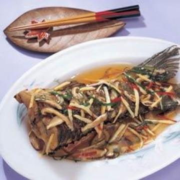 鲩鱼尾段400克,竹笋20克,香菇8朵,花生油2汤匙,生姜丝1/2茶匙,红辣椒1根,大葱末1汤匙,太白粉(生粉)1茶匙,绍酒1茶匙,高汤(或清水)120毫升,酱油3汤匙,糖1茶匙,胡椒粉、麻油适量