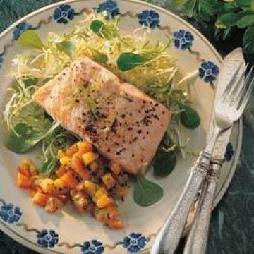 鲑鱼(三文鱼)肉4块,每块175克,橄榄油1汤匙,酱汁材料:,小芒果1个,小番木瓜1个,生姜1片,长212厘米,薄荷叶1把,莱姆(青柠)1个,盐、黑胡椒适量
