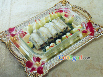 1、鲫鱼剔出骨,鱼肉一分为两片,加调料腌制入味,汆水至熟,做成卷筒状摆放盘中。