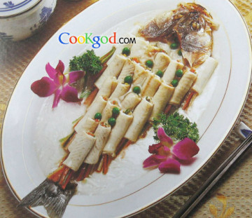 2、将配料调好口味,均匀地卷在20片鱼肉内,放在鱼池内,连同鱼的头尾一起入笼中蒸熟。
