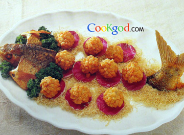3、鱼圆中酿入芝士酱,拍面包粒,入油锅炸成金黄色,与炸好的鲮鱼头、尾摆盘,装饰即成。