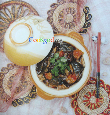 2、将水鱼用干生粉15克捞匀。烧镬下油,放入水鱼泡油至七成熟倒在笊篱里,随即落料头、火腩、花菇、水鱼、烹酒爆香,放上汤,调入所有味料略煮,用湿粉打芡,后转放在瓦罐里,然后在炉上里煲香,放麻油并加上煲盖即成。