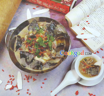3、先将水鱼飞水后倒在疏壳里沥干,然后烧镬落油,落姜片、水鱼、烹酒,放上汤和枸杞子、淮山药、圆肉连汁,调入所有味料待滚,加麻油、胡椒粉、生油后倒在预先准备好的镬仔里,上台时跟酒精炉加热便成。