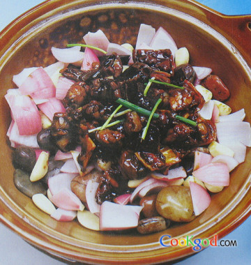 2、雨花石放入烤箱加热(80~100摄氏度),放入沙锅,铺上蒜头、洋葱、甲鱼块,浇上用蚝油、美极鲜酱油、鱼露、玫瑰露调好的调味汁,盖上沙锅盖,焗5分钟即可上桌。
