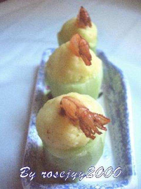 1.土豆切块,比女士麻将薄些,放在容器里,放两茶匙水,盖盖子,放入微波炉,叮15分钟左右,然后用勺子研成糊状,加两两茶匙夹面包的黄油,少许盐和糖,少许白胡椒面,搅拌均匀,黄瓜切段,用挖勺挖去黄瓜囊,留底也可以;
