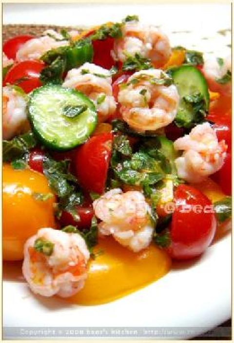 虾仁,盐,黑胡椒,宝石番茄,小黄瓜,柠檬汁,橄榄油,荆芥,沙拉