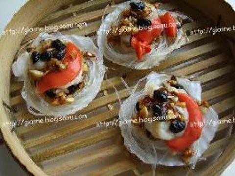 5.在粉丝上放上扇贝肉 再淋上少许的酱汁,置于蒸屉上 水开后下锅蒸熟即可。