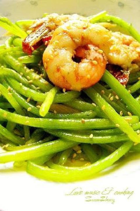 3.竹笋切丝,蒜切蒜片,锅子烧热,加入油,放入蒜片,变黄出香味加入蒿子杆,旺火快炒放入虾仁,加入少许香油,关火,然后放入盐、鸡精,撒点芝麻就可以了。(如果有水分溢出,可以用淀粉水沟勾下芡)
